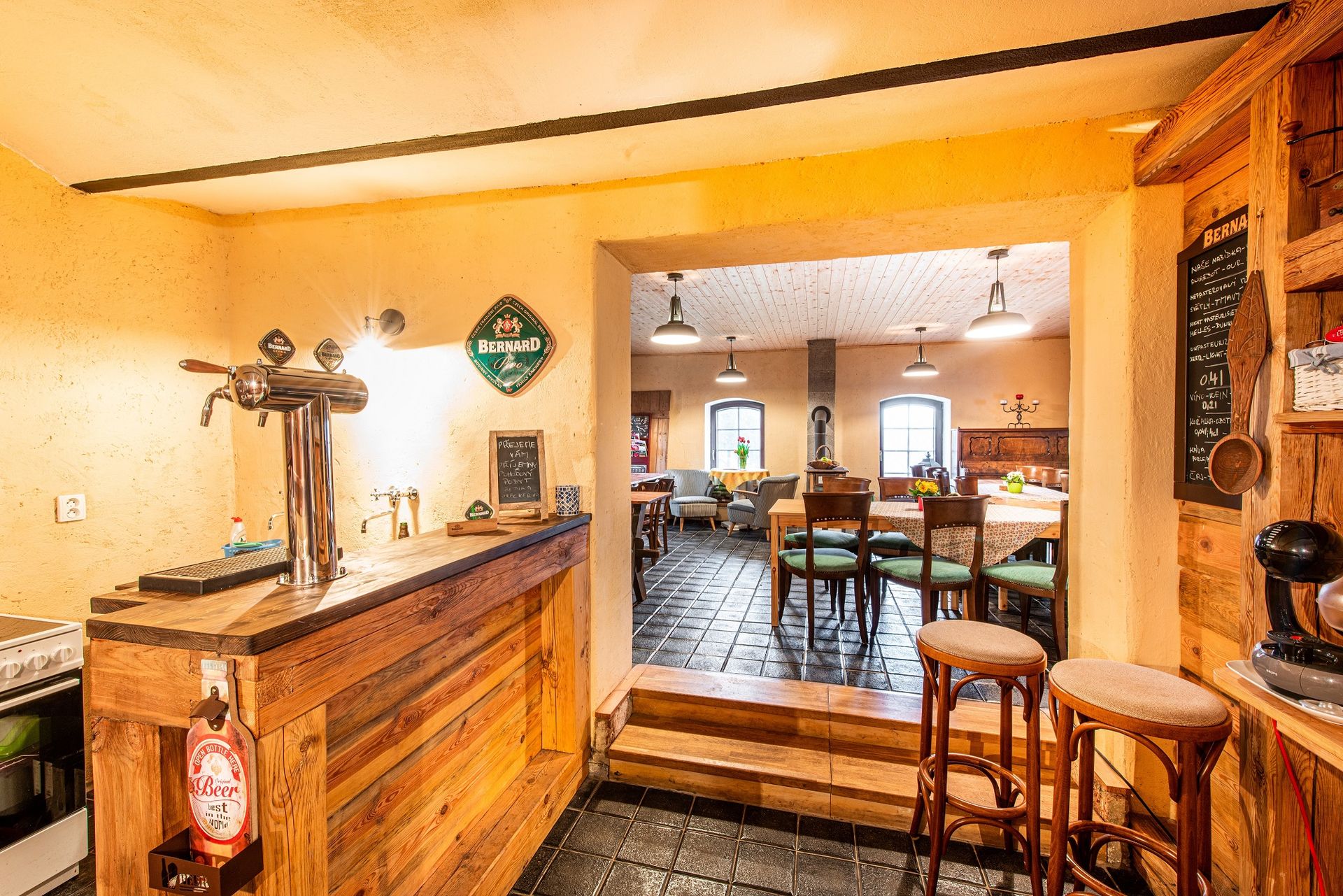 Pro naše hosty jsme připravili malou „Osvěžovnu“ s kapacitou 30 osob, která je k dispozici po celou dobu Vašeho pobytu a je otevřena 24 hodin denně. Náš společenský prostor lze využít k aktivitám dle Vašeho přání a zároveň se u toho příjemně osvěžit! Pro milovníky piva máme vždy naražený soudek piva Bernard, bíle a červené víno a také různé druhy kávy a čaje. Prostor je vhodný jak pro rodiny s dětmi, tak i pro partu přátel nebo společenské a firemní akce.